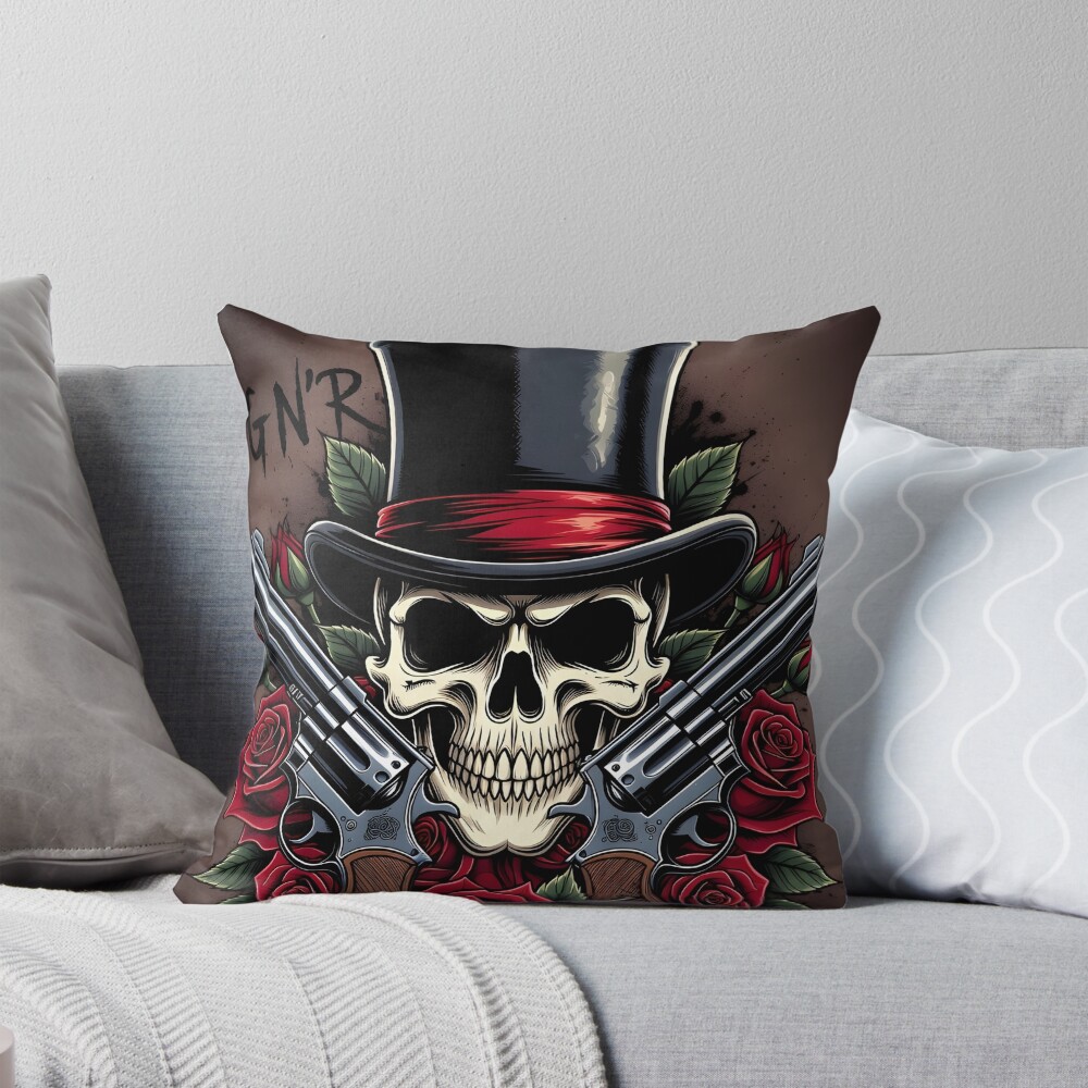 This striking Guns N’ Roses inspired wall art captures the iconic rock ‘n’ roll spirit of the legendary band. Featuring a bold skull wearing a classic top hat, crossed revolvers, and blood-red roses, this illustration embodies the rebellious energy and timeless aesthetic of hard rock culture.